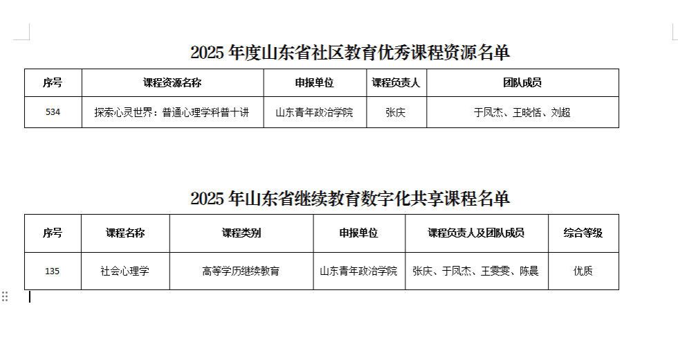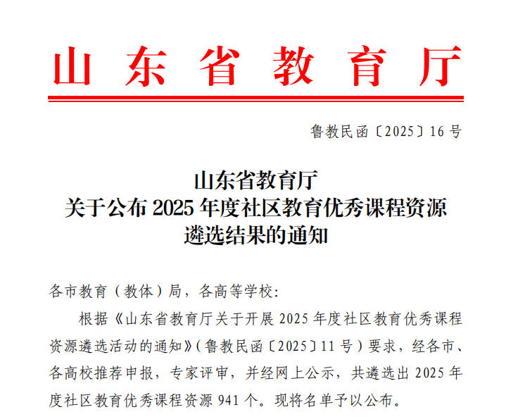 近日,由山东省教育厅组织开展2025年度社区教育优秀课程资源遴选和2025年度继续教育数字化共享课程遴选活动结果公布。经高校推荐申报、专家评审等评选环节,共遴选出社区教育优秀课程资源941个,继续教育数字化共享课程205门。其中我校申报《探索心灵世界:普通心理学科普十讲》获评社区教育优秀课程资源,《社会心理学》获评数字化共享优质课程。