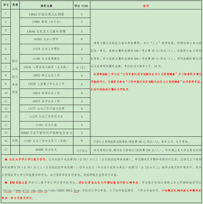 社会工作(专升本) 本科文凭及学士学位颁发院校:山东大学 专业代码:030302